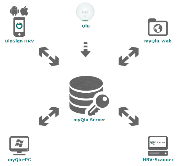Von der professionellen HRV-Analyse mit dem HRV-Scanner in der Praxis über das selbstständige Biofeedback mit dem Qiu und der Smartphone App zuhause und unterwegs, bis zum HRV-Monitoring über den myQiu-Server und der automatisierten Unterstützung beim Coaching.