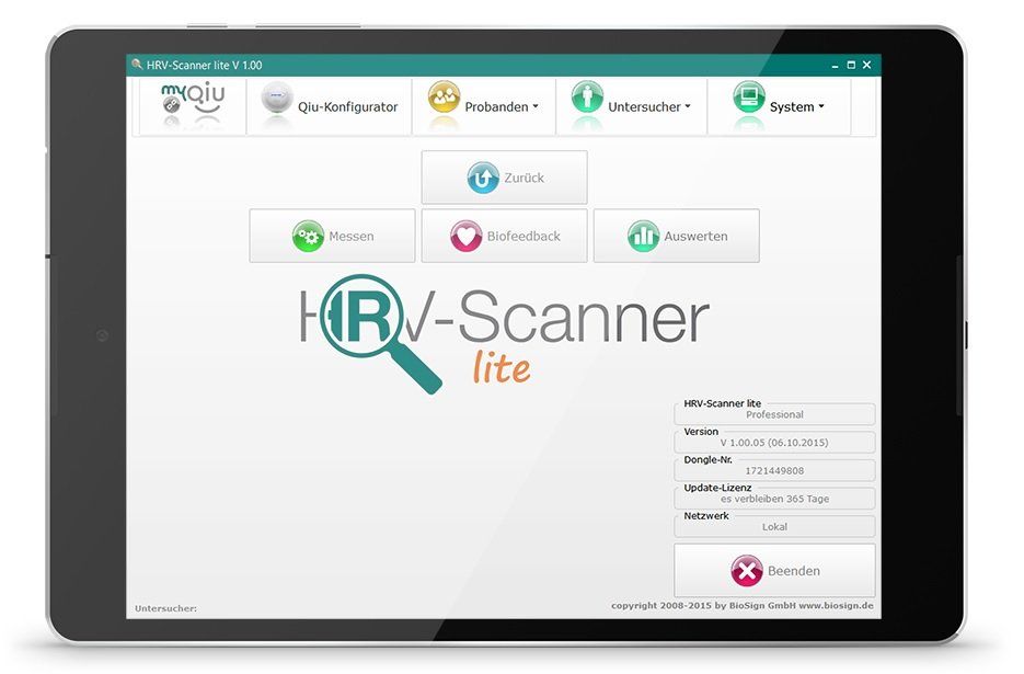 HRV measurement, HRV biofeedback and connection to myQiu/Qiu offer HRV beginners everything they need in daily practice. When developing the HRV-Scanner lite, we paid particular attention to the simple and intuitive usability of the software on the tablet. Tutorials built into the program make it easier to use.