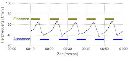 Regulación parasimpática óptima de la frecuencia cardíaca de una persona deportista y sana. Se puede ver claramente el aumento de la frecuencia cardíaca al inhalar y su caída al exhalar como expresión de un sistema nervioso parasimpático sano y eficiente.