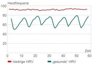 La paz interior, la autocuración y la regeneración requieren un sistema nervioso parasimpático intacto y activo. Este “freno interior” se puede entrenar específicamente. La actividad del sistema nervioso parasimpático se puede medir mediante la denominada variabilidad de la frecuencia cardíaca (abreviada: HRV), p. B. con un dispositivo de biorretroalimentación. Se aplica lo siguiente: cuanto mayor sea esta VFC, más saludable será su sistema nervioso autónomo. (ver ilustración).